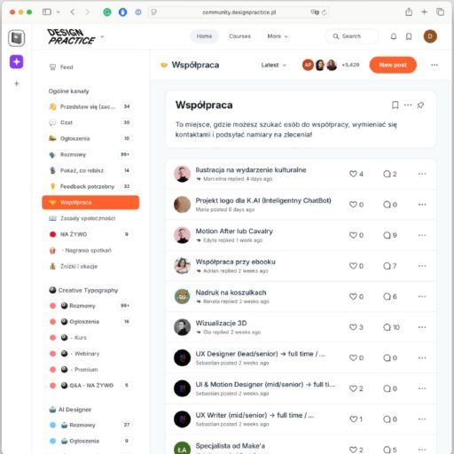 Wydajemy kompleksowe kursy online z najlepszymi autorami w branży, a specjalizujemy się w tematach na styku projektowania graficznego i technologii – UX, UI, web design, AI, interaction design, brand design, typografia, czy projektowanie i wdrażanie w Webflow. Pod swoje skrzydła wzięłyśmy już prawie 7000 osób. Prowadzimy też Design Practice Podcast oraz dodatkowo występujemy na konferencjach. Czy edukacja może być rozrywką? U nas zdecydowanie tak! Nasze kursy to nie tylko lekcje, ale też społeczność. Wszystkie osoby dołączające do naszych produktów, otrzymują dostęp do zamkniętego forum, które kipi od cennych wskazówek, wątków i dyskusji.